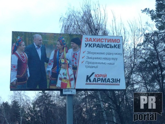 «Тоже оппозиционер» Юрий Кармазин, которому власть не дает ни одного билборда, все же каким-то мистическим образом заклеивает своей агитацией рекламные площади. Поскольку одной бородой мил не будешь, на наружке Кармазина появились девушки, дети и украинские национальные веночки.