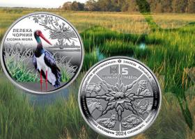 Відродження. Лелека чорний”. Це четверта монета з серії, присвяченої відродженню дикої природи на території Чорнобильського заповідника.На реверсі монети на тлі пейзажу зображено лелеку чорного, над яким угорі – пташенята в гнізді.