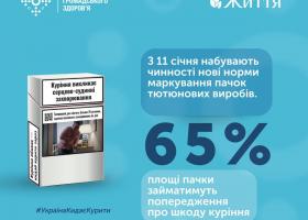 Тепер на 65% площі упаковки буде розміщено зображення хвороб, спричинених курінням, та текст, який застерігає про шкоду та наслідки куріння.