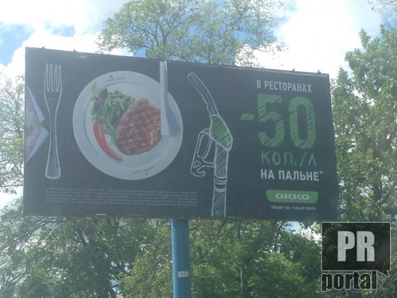 Несколько странную рекламную кампанию запустила сеть АЗС ОККО. "В ресторанах -50 коп./л. на топливо", - сообщают билборды со специфическим столовым прибором для токсикоманов.