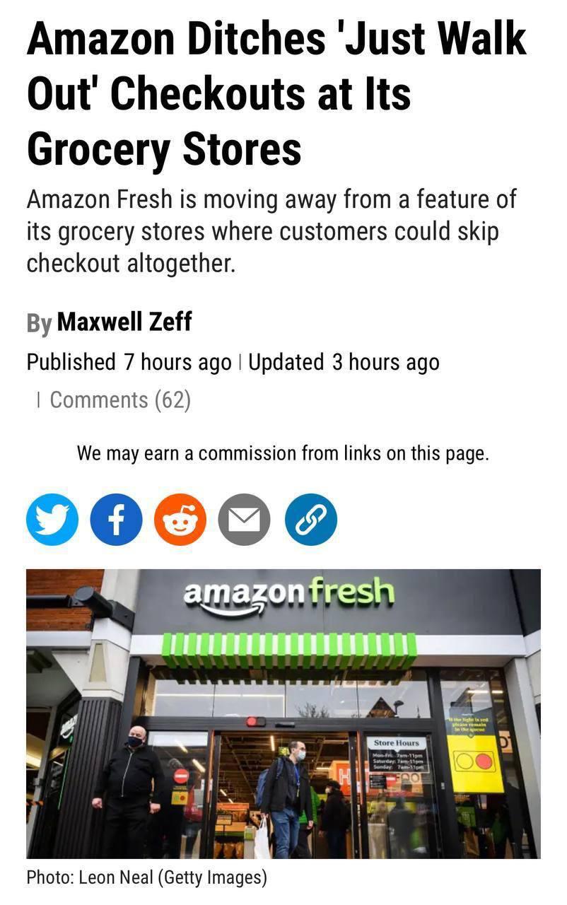 Зазначається, що основною причиною закриття магазинів із технологією «Бери та йди» стала неможливість у повному обсязі автоматизувати систему оплати. Замість датчиків зчитування за покупцями спостерігали по камерах понад 1000 найманих співробітників з Індії, які в ручному режимі стежили за клієнтами магазинів, щоб забезпечити точність у формуванні чеків про покупки.