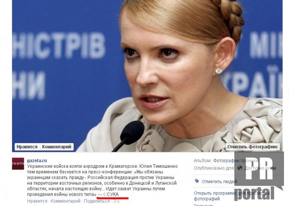 На официальной странице издания газета.ru в Facebook Тимошенко назвали сукой. Соответсвующим тегом редакторы соцстраницы отметили фотографию Тимошенко и публикацию её "беснований" с пресс-конференции.