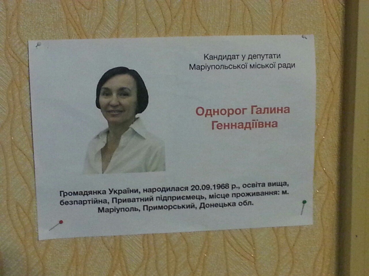 Сьогодні, 29 листопада, на ДВК №142416 (за адресою вул. Лавицького, 7) та ДВК №142415, які знаходяться в одній будівлі, кандидат в депутати Маріупольської міської ради від ВО «Батьківщина» Галина Однорог власноруч розвішувала листівки з автобіографією.