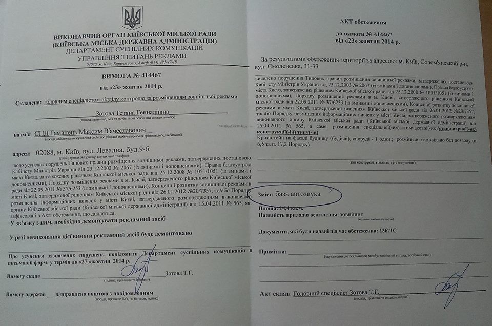 Та на цьому плакаті Київреклама побачили рекламу тільки БАЗИ АВТОЗВУКУ та надіслала вимогу про демонтування банеру.Але згідно закону України про рекламу ч.6 ст.9 Вивіска чи табличка з інформацією про ЗАРЕЄСТРОВАНЕ найменування особи, ЗНАКИ ДЛЯ ТОВАРІВ І ПОСЛУГ, що належать цій особі, вид її діяльності (якщо це не випливає із зареєстрованого найменування особи), час роботи, що розміщена на внутрішній поверхні власного чи наданого у користування особі приміщення, на ЗОВНІШНІЙ поверхні будинку чи споруди не вище першого поверху або НА ПОВЕРСІ, де знаходиться власне чи надане у користування особі приміщення, біля входу в таке приміщення, НЕ ВВАЖАЄТЬСЯ РЕКЛАМОЮ ";
