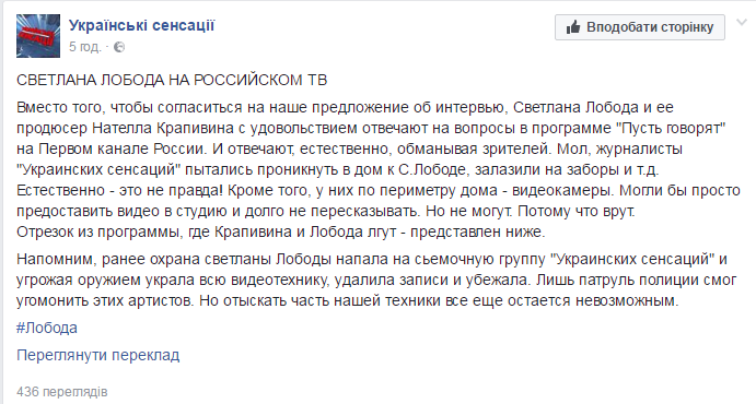 У свою чергу Крапівіна, частково визнаючи звинувачення співробітників 1+1, заявила, що вся ця історія є нібито провокацією, після якої Лободі почали погрожувати якісь "радикали", а ведучий програми заявив, що українські журналісти просто заздрять співачці і мстять їй за якийсь "нейтралітет".