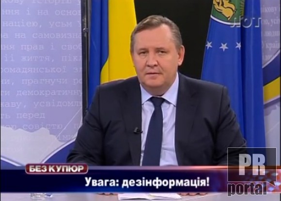 Коли керівник ОДА розповідав про 72 людини, які прийшли на Євромайдан в Луганську, на екрані з'явився напис "Увага: дезінформація!"