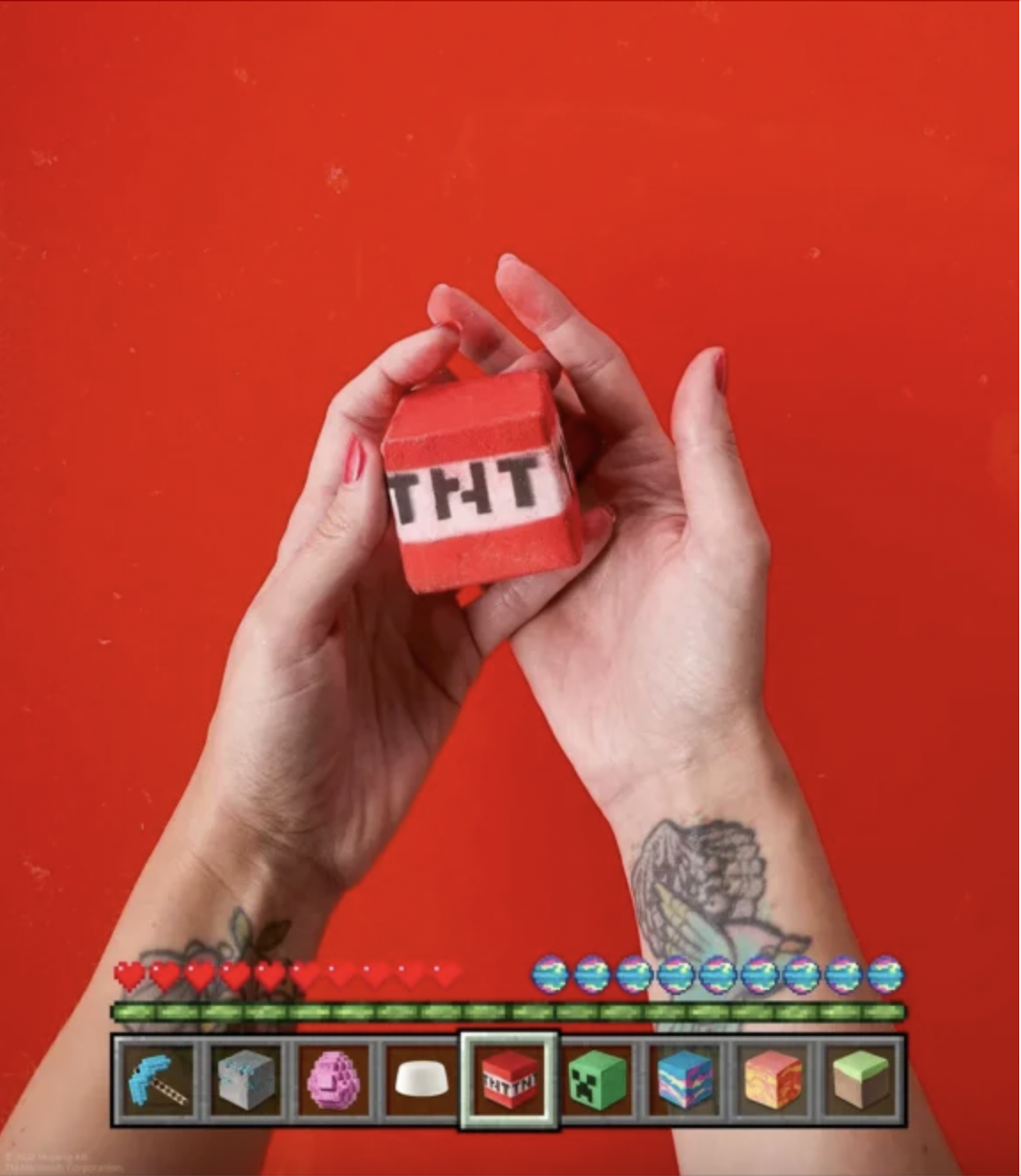 Поєднання найпопулярнішого продукту Lush та визначального елементу Minecraft, «блоки-бомби для ванни» колекції оживають у ігровому всесвіті завдяки різноманітним ароматам. Шанувальники можуть вибирати між землистим блоком «Трава», запашною «Діамантовою рудою», лимонною «Лавою», свіжим і квітковим блоком «ТНТ» та іншими, кожен з яких має заспокійливі властивості.