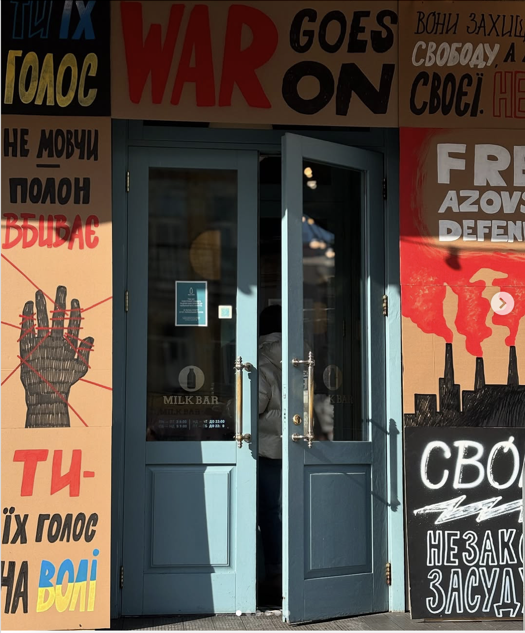 До третьої річниці повномасштабного вторгнення росії в Україну мережа ресторанів Milk Bar та Асоціація родин захисників «Азовсталі» вкрили блакитний фасад закладу постерами із гаслами на підтримку військовополонених та зниклих безвісти.