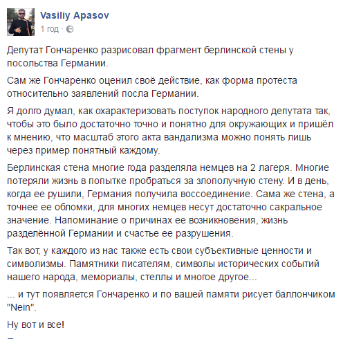 Про це йдеться в повідомленні, опублікованому на сайті посольства. "Посольство Федеративної Республіки Німеччина дуже жалкує у зв'язку з пошкодженням і нівечення депутатом Гончаренко фрагмента історичної Берлінської стіни, розташованої на території посольства. Падіння Берлінської стіни для всіх європейців, а також і за межами Європи, символізує звільнення від комунізму і радянської гегемонії. У той же час має місце порушення Віденської конвенції про дипломатичні зносини ", - йдеться в повідомленні.