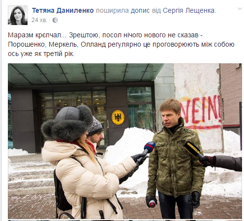Заступник голови фракції БПП в парламенті Олексій Гончаренко провів під будівлею посольства Німеччини у Києві акцію. Протестував проти заяви німецького посла Ернста Райхеля про можливість проведення виборів на Донбасі за присутності російських військ.