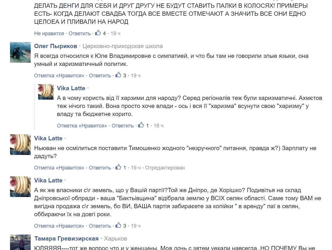 «Шановна Юліє Володимирівна! Нажаль, не можу дозвонитися, напевно - це суто для "своїх" та звичайного глядача з нерзучними питаннями слухати не хочуть. Вам мне соромно брехати в прямому етері?, - написала користувач Facebook Vika Latte та додала низку запитань до Тимошенко. - Дякую "чесному" каналу Ньюсван, який запрошує до спілкування, але насправді не дає можливіості поставити питання, а, вочевидь, просто запрошує Тимошенко на "бенефіс". Жодного жортсокого питання, монолог....».