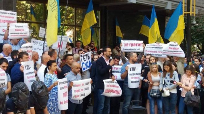 Активісти вимагають від генпрокурора Юрія Луценка звільнити прокурора Дмитра Суса, якого вважають причетним до затримання двох співробітників НАБУ, повідомляє ВВС України