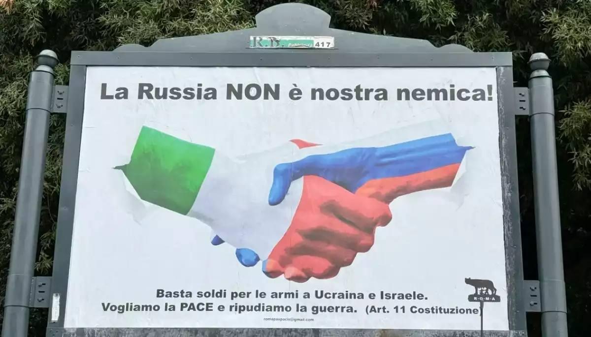 Цього літа по всій Італії з'явилися сотні проросійських плакатів із гаслом «Росія не наш ворог» і зображенням рукостискання в кольорах італійського та російського прапорів. Деякі плакати також закликають зупинити фінансування озброєнь для України та Ізраїлю.