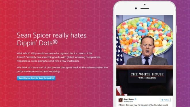 "Зачем кому-то выступать против "мороженого будущего"? Возможно, это связано с теориями заговора о глобальном потеплении", - говорится на сайте Senddippindots, обещающем послать Спайсеру пару грузовиков мороженого.