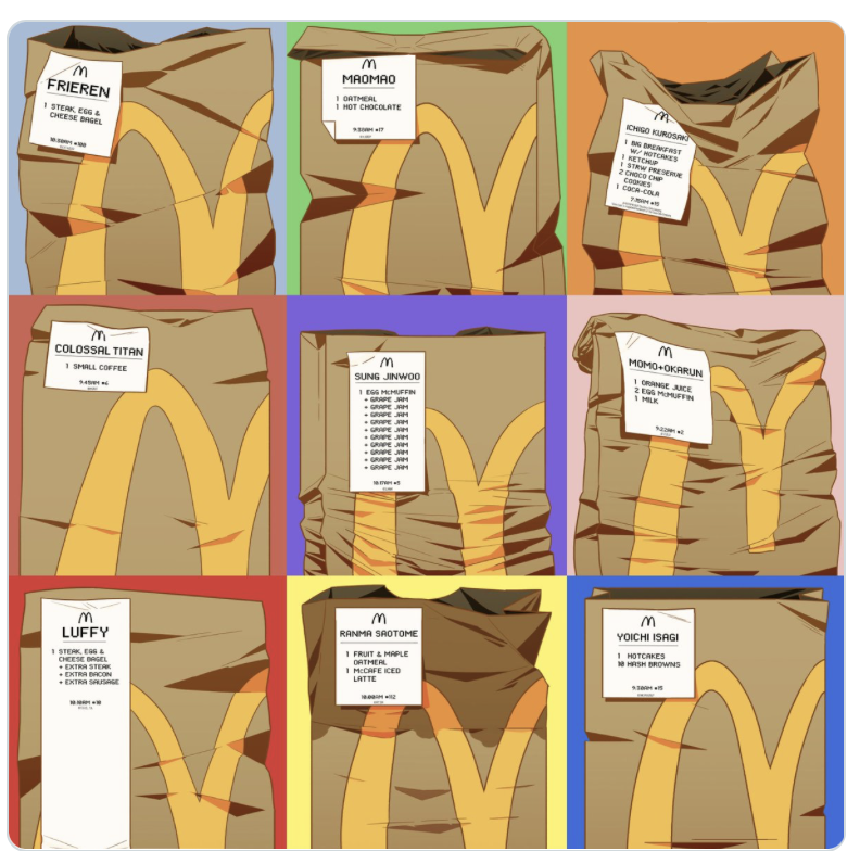 McDonald’s пропонує до бургерів та картоплі фрі порцію аніме-фандома. На честь премії в галузі аніме Crunchyroll Anime Awards 2025 року мережа фаст-фуду показала, що замовляють собі на сніданок герої популярних аніме.