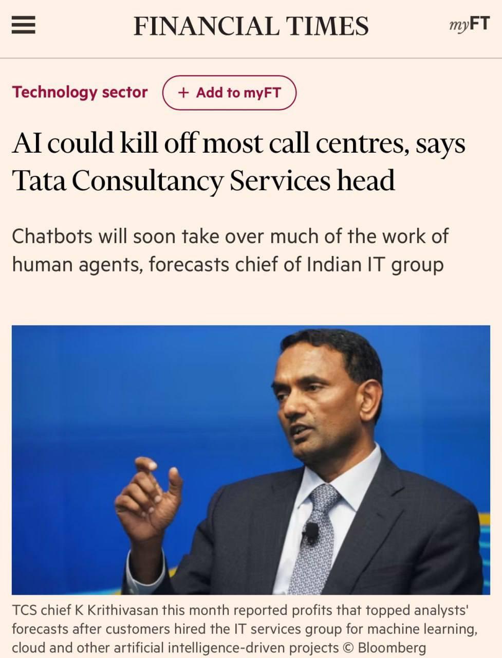 Керівник індійської ІТ-компанії Tata Consultancy Services К Крітівасан заявив Financial Times, що штучний інтелект призведе до «мінімальної» потреби в кол-центрах уже через рік.
