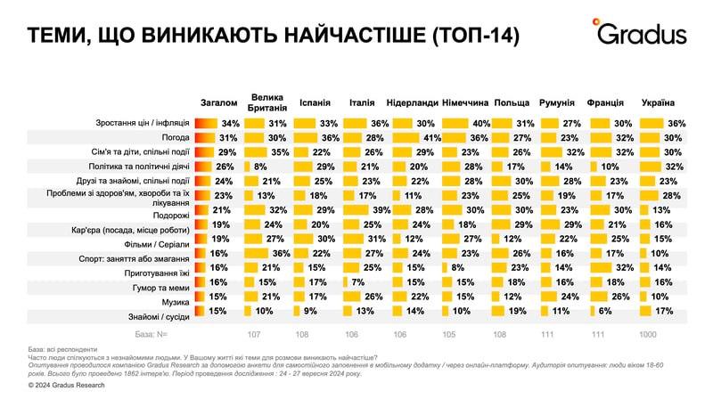 Серед європейців теми для коротких розмов часто варіюються залежно від країни. Дослідження каже, що наприклад, британці найчастіше починають зі спорту, італійці — з подорожей, а німці — з питань інфляції. Українці, у свою чергу, часто говорять про політику — 32% респондентів згадують цю тему у своїх смолтоках.