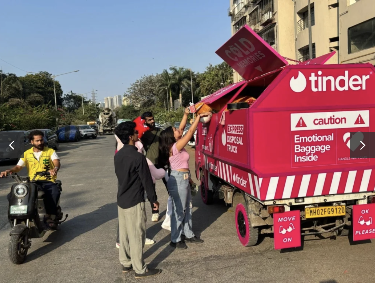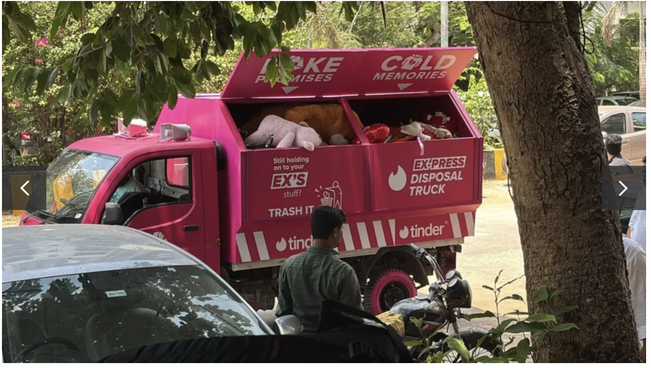 Вантажівка у кольорах Tinder подорожує кількома індійськими містами, запрошуючи перехожих викинути предмети, пов’язані з їхніми колишніми. Подарунки, фотографії, м’які іграшки або записки — все, що нагадує про колишні стосунки, вітається у цьому незвичайному смітнику.