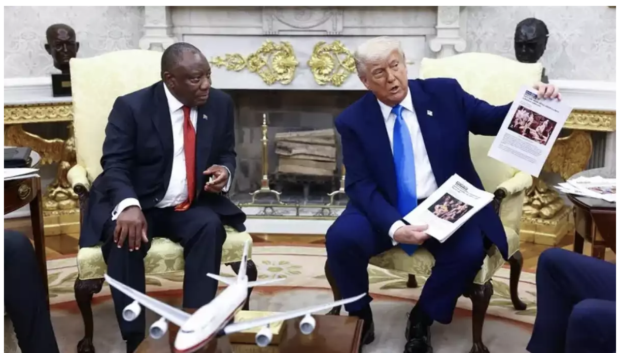 Під час трансляції зустрічі в Овальному кабінеті з президентом ПАР Сирілом Рамафосою Трамп перервав обговорення, щоб показати відео, яке, за його словами, свідчило про «геноцид білих фермерів у ПАР». Як зауважили в Reuters, цю теорію змови роками поширюють в ультраправих інтернет-спільнотах.
