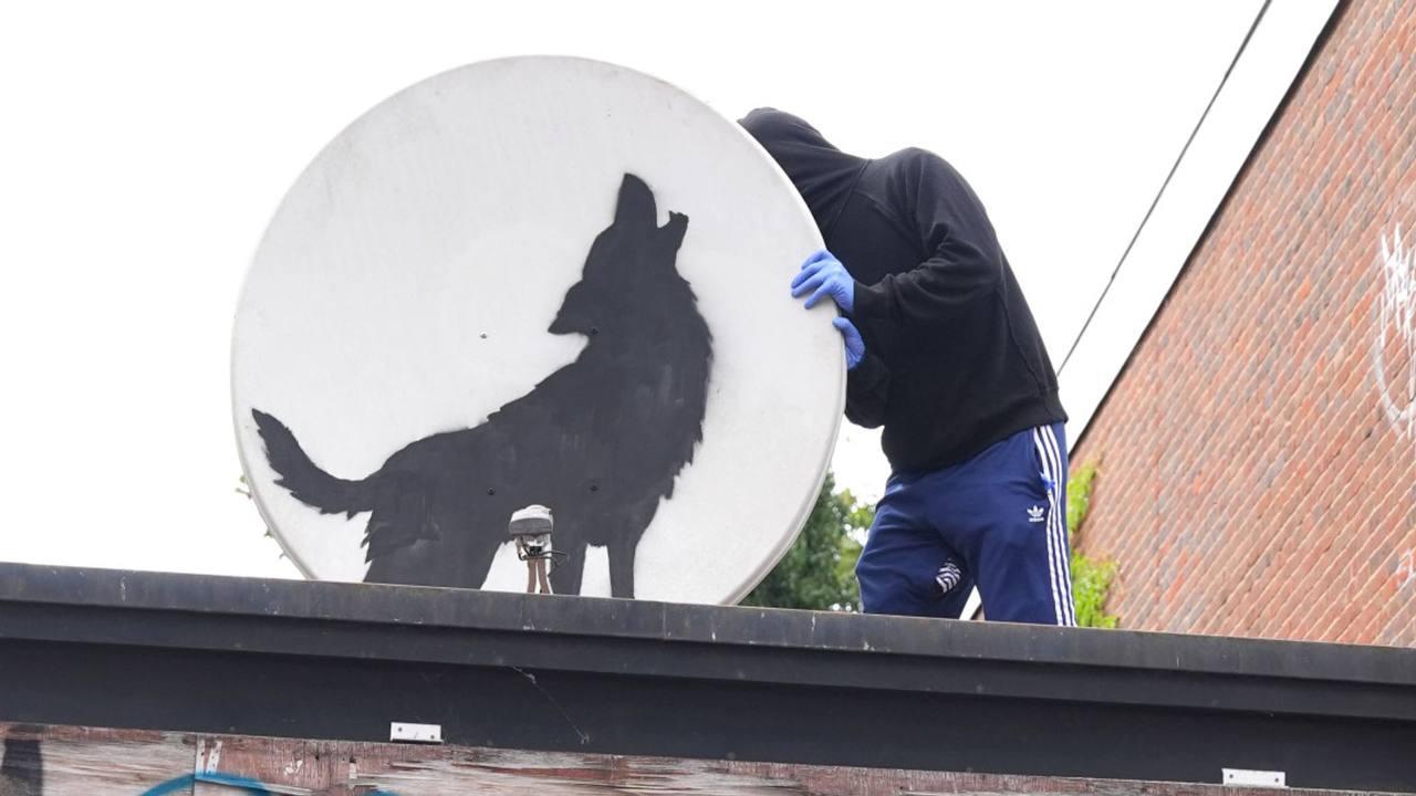 Це одна з нових робіт художника. На ній вовк виє на супутниковій тарілці, повідомляє Sky News.
