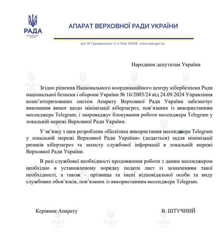 - заборона встановлювати і користуватися клієнтом Telegram на службових комп’ютерах або особистих комп’ютерах, які використовуються в службовій діяльності;