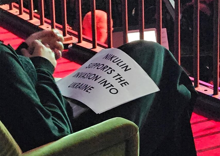 На кадрах, які опублікувала циркова артистка, можна побачити, як на початку номера вона з'являється на сцені, загорнута в український прапор. У руках дівчина тримає аркуші паперу з написом: «Нікулін підтримує вторгнення в Україну». Також вона показала знімок Нікуліна в оточенні людей у військовій формі.