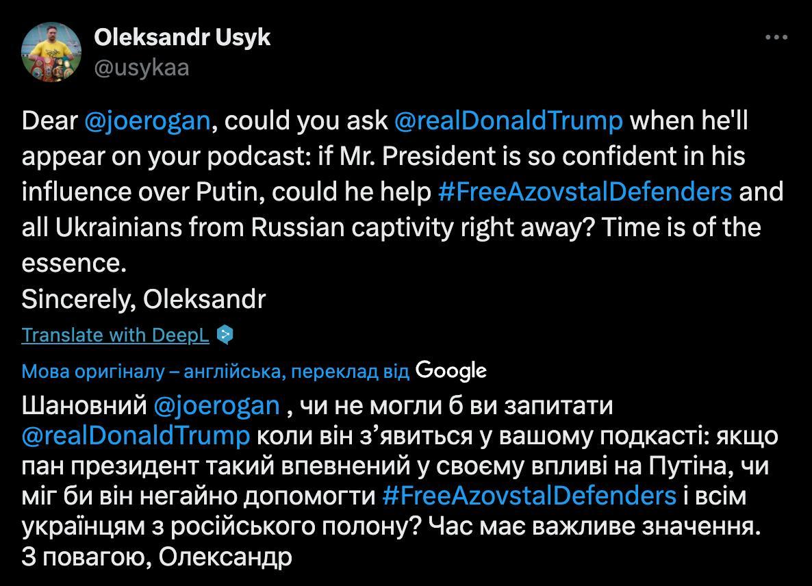 «Якщо пан президент такий впевнений у своєму впливі на путіна, чи міг би він негайно допомогти звільнити захисників “Азовсталі” та всіх українців із російського полону? Час має важливе значення».— написав боксер.