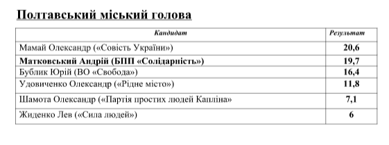 У другий тур виборів міського голови Полтави виходять нинішній міський голова Олександр Мамай та екс-мер Андрій Матковський.