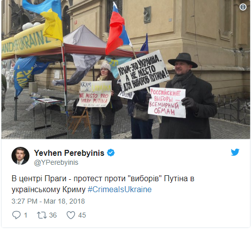 У Празі також відбувся протест проти "виборів" Путіна в українському Криму, повідомив посол України в Чехії Євген Перебийніс.