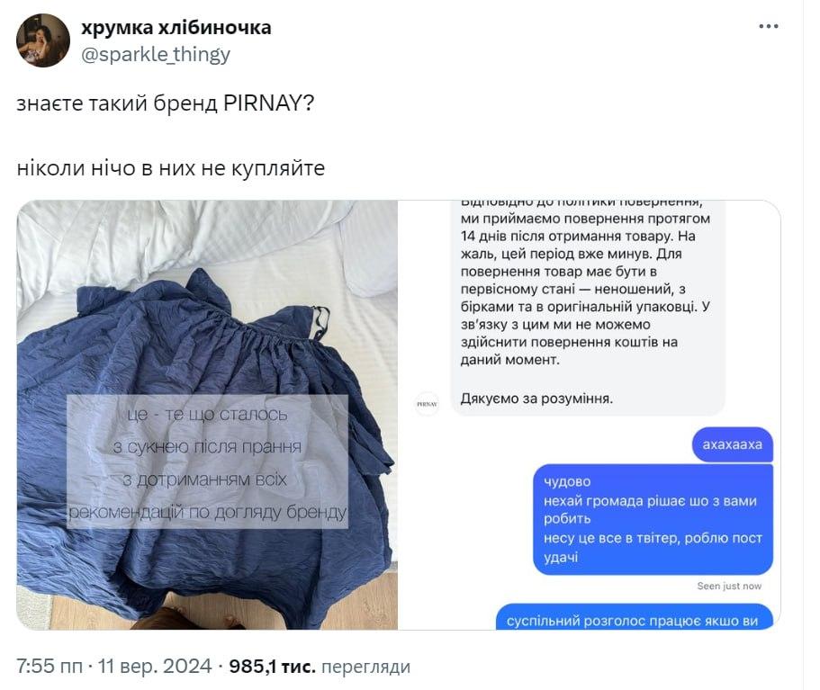 Українська блогерка Сафіє Лентер-Кизи опублікувала твіт, в якому обурювалась вигляду плаття бренду PIRNAY після прання. А ще прикріпила скріни переписки із customer care і співзасновницею компанії, де обіцяла «суспільного розголосу і прокатати на шакалячому експресі».