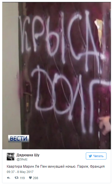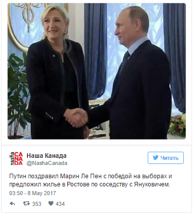 У Франції вночі оприлюднили результати підрахунку 99,99% бюлетенів на президентських виборах: лідер руху "Вперед!" Еммануель Макрон набрав 66,06% голосів - удвічі більше за Марін Ле Пен, главу "Національного фронту", яка відкрито симпатизує Кремлю. Очевидно, такі результати стали неприємною новиною не лише для керівництва РФ (ЗМІ нерідко вказували на фінансування партії Ле Пен Росією), а й для звичайних росіян, які також стежили за гонкою у Франції: більше 60% громадян цієї країни підтримували її обрання главою Франції, пише ТСН