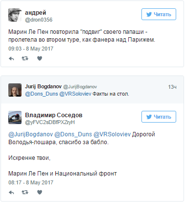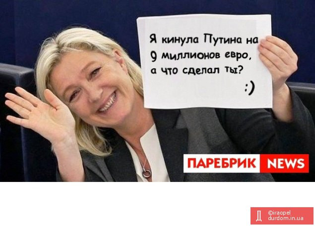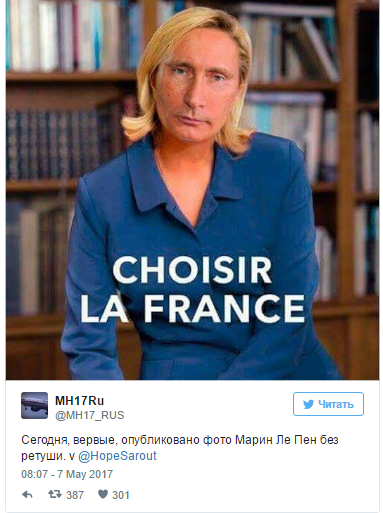 У Мережі щонайперше звернули увагу на "фінансовий бік" і більшість жартів присвятили саме "боргу" Ле Пен перед Путіним, який нібито підтримував грошима її кампанію: сподіваючись на майбутній союз між державами.