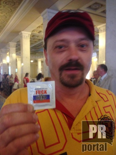 Эпатажный художник Сергей Поярков в Верховной Раде раздавал народными избранниками презервативы "Fuck Путлер".