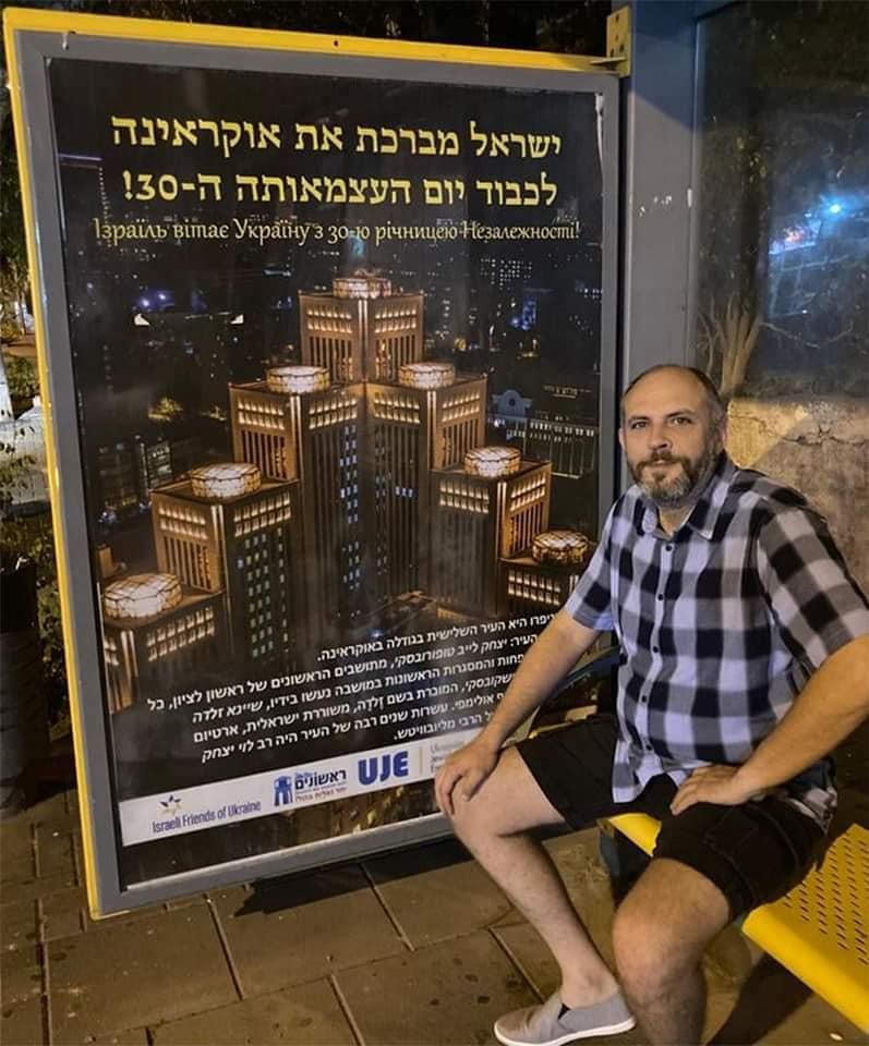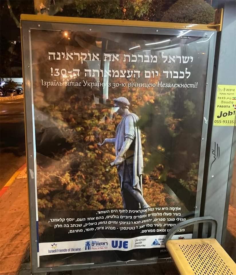 Накануне Дня Независимости Украины остановки автобусов в израильском городе Ришон Ле-Цион украсили плакаты с видами городов Украины и поздравлением с праздником на иврите и на украинском языке.