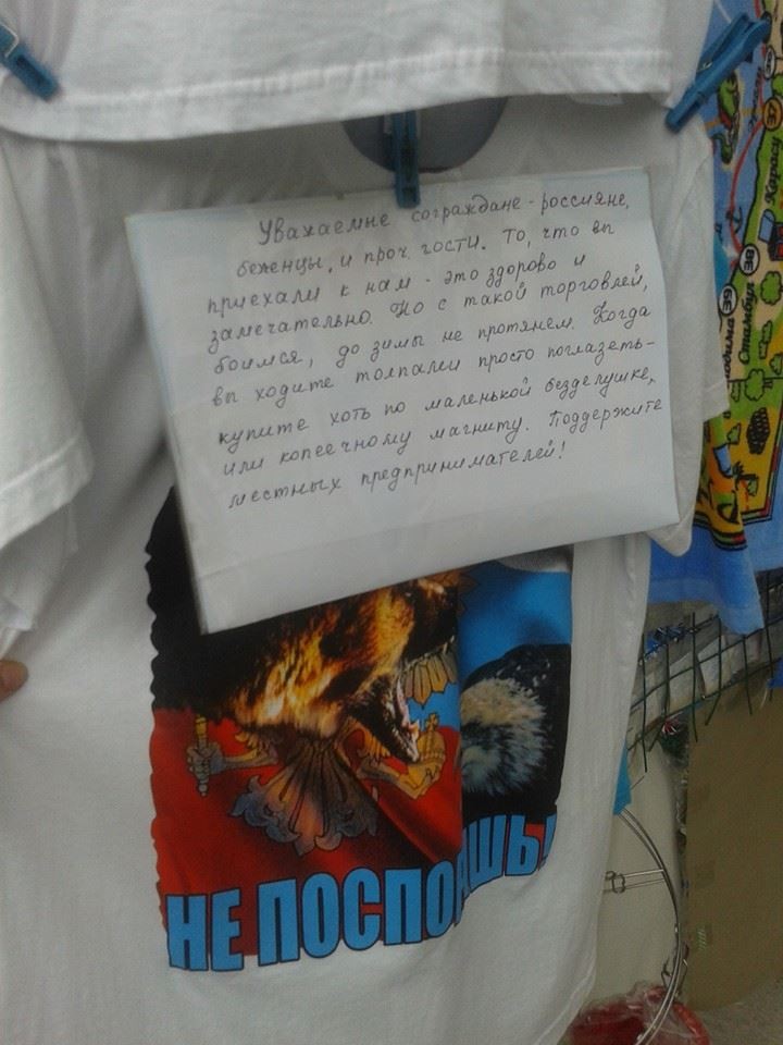 «То, что вы приехали к нам - здорово и замечательно. Но с такой торговлей, боимся, до зимы не дотянем. Когда вы ходите толпами просто поглазеть - купите хоть по маленькой безделушке или копеечному магниту. Поддержите местных предпринимателей!», - говорится в записке, вывешенной на одной из палаток с сувенирами.