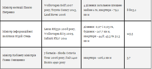 Цікавою також є декларація найбагатшого міністра  - головного юриста країни Петренко. Він нікого не вказав в графі "склад сім'ї", але для чогось тримає 4 земельних ділянки загальною площею до одного гектара та три автомобілі. Заощадження міністра складають без малого 9 млн грн.