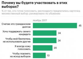 58% россиян в той или иной степени выразили желание проголосовать на выборах президента 18 марта 2018 года, следует из опроса Левада-центра, проведенного в конце ноября. 34% опрошенных заявили, что, скорее всего, будут голосовать, и 24% — что совершенно точно проголосуют. 20% респондентов не определились, пойдут на выборы или нет.